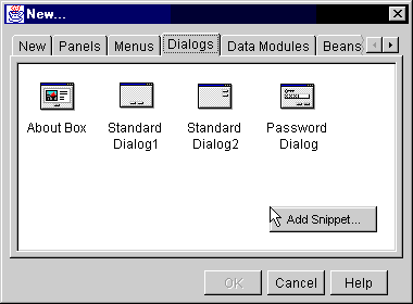 We can add our own code snippets - little pieces of code - to the New... dialog in JBuilder. To see the different options available for parameterizing the code snippets, we can open the Snippets project file, located in the JBuilder\snippets folder. This project contains examples of code snippets, and the ExampleSnippet.snippet file, showing all available parameters. Take a look at this file, and see what is possible. We will use some of these parameters for our splash window code snippet.